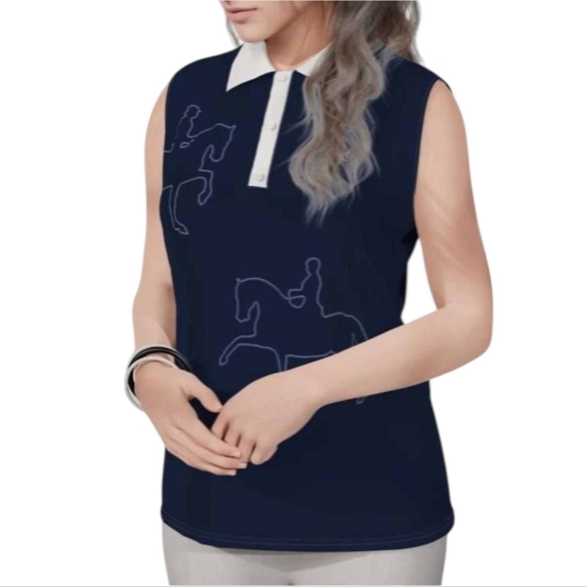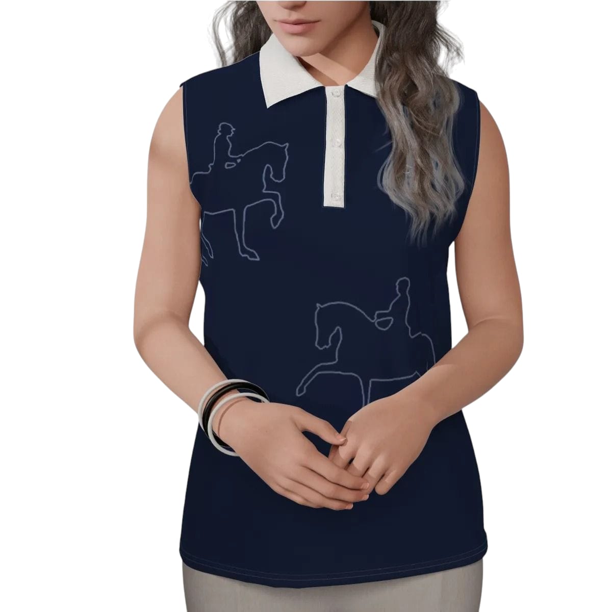 Express your passion for dressage elegantly with the PIAFFÉ sleeveless polo shirt. Its deep navy blue, subtly contrasted by an immaculate white collar, adds a touch of distinction to your silhouette while remaining comfortable and breathable.