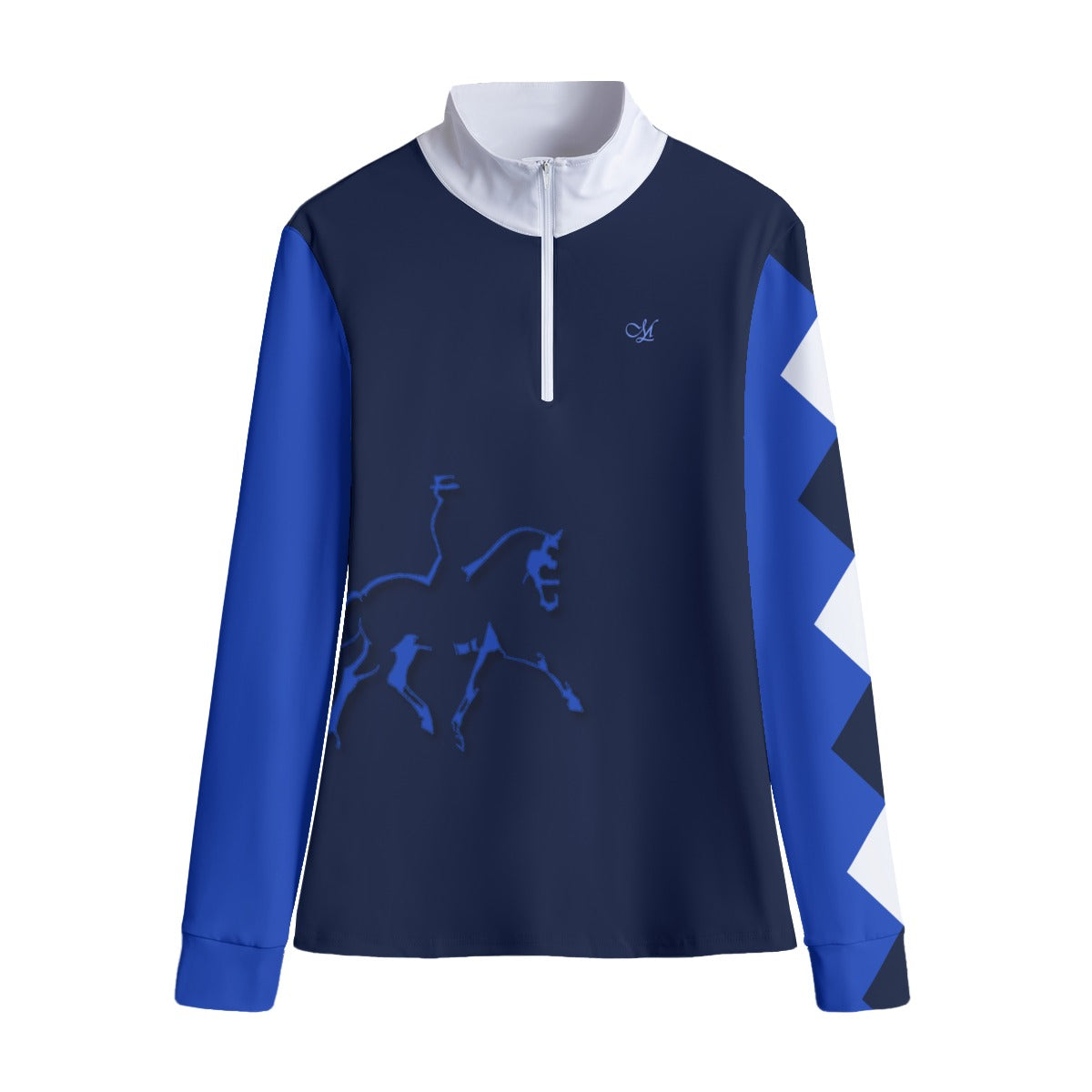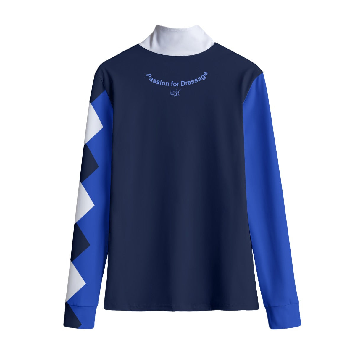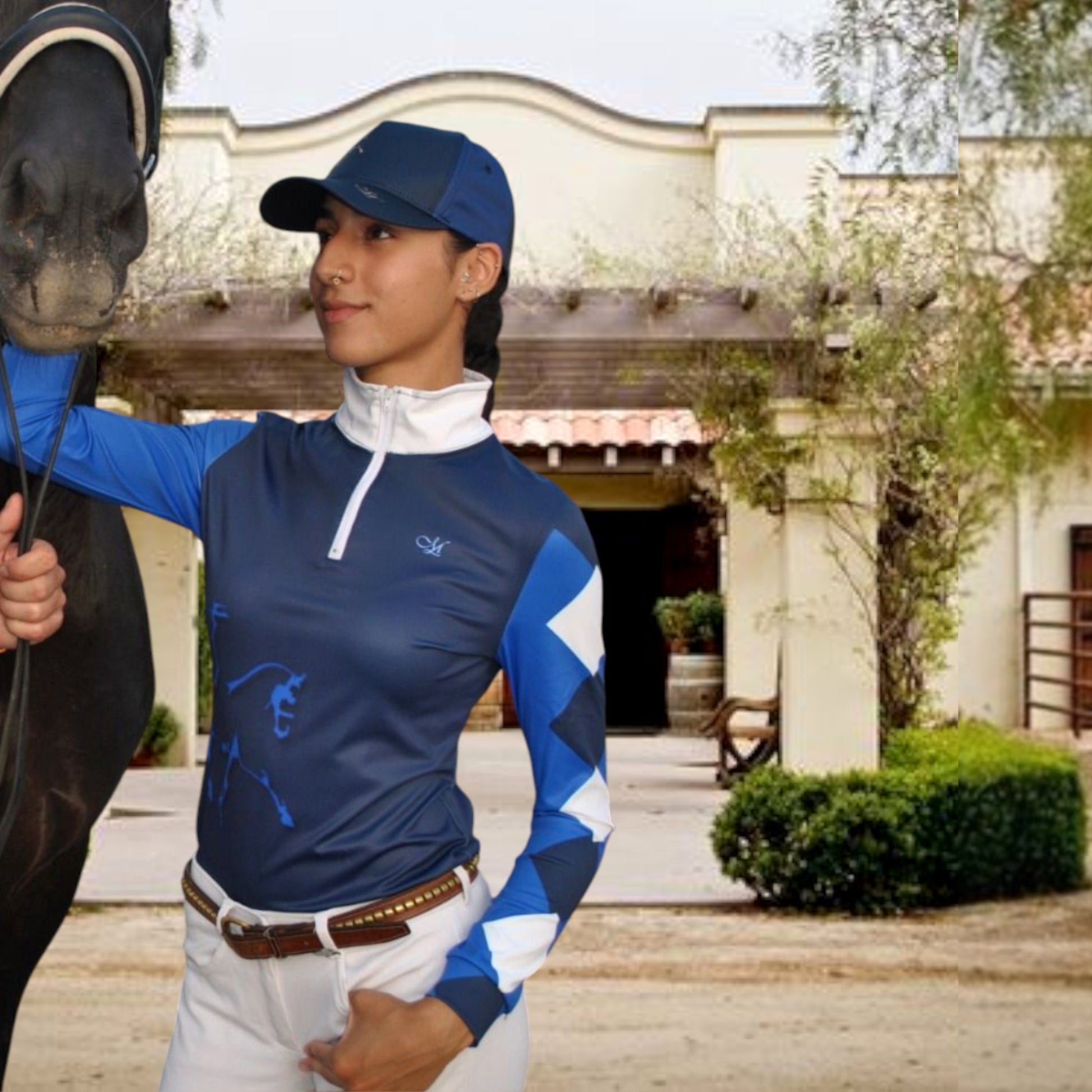 Affichez votre passion avec audace grâce à ce sweat-shirt aux couleurs vives, mêlant un bleu marine élégant à un bleu roi raffiné, rehaussé d’un damier moderne sur la manche droite. Un cheval stylisé discret sur le côté gauche rappelle votre attachement à l’élégance équestre tout en affirmant votre style.