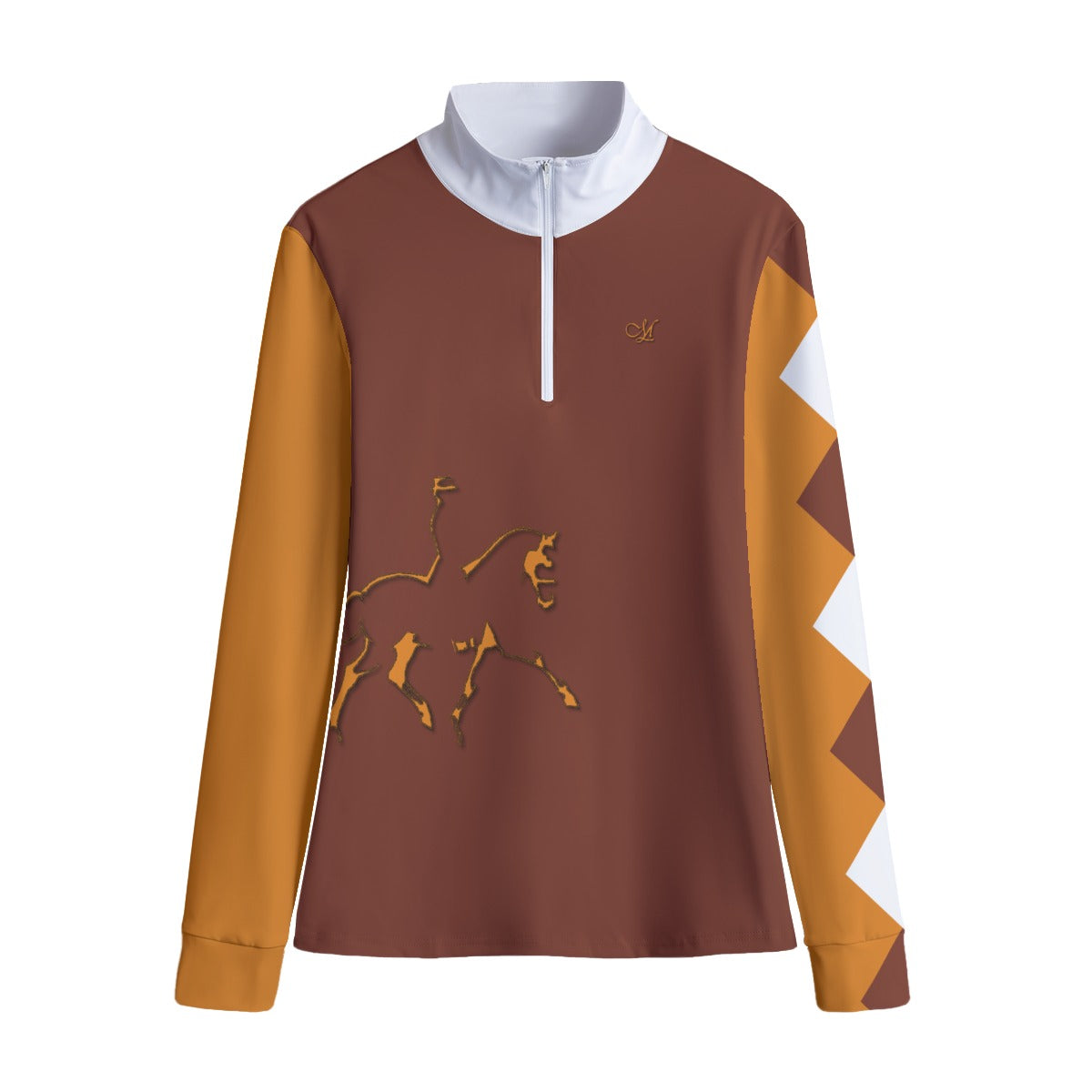 Affichez votre passion avec audace grâce à ce sweat-shirt aux couleurs vives, mêlant un marron profond et un orange lumineux, rehaussé d’un damier moderne sur la manche droite. Un cheval stylisé discret sur le côté gauche rappelle votre attachement à l’élégance équestre tout en affirmant votre style.